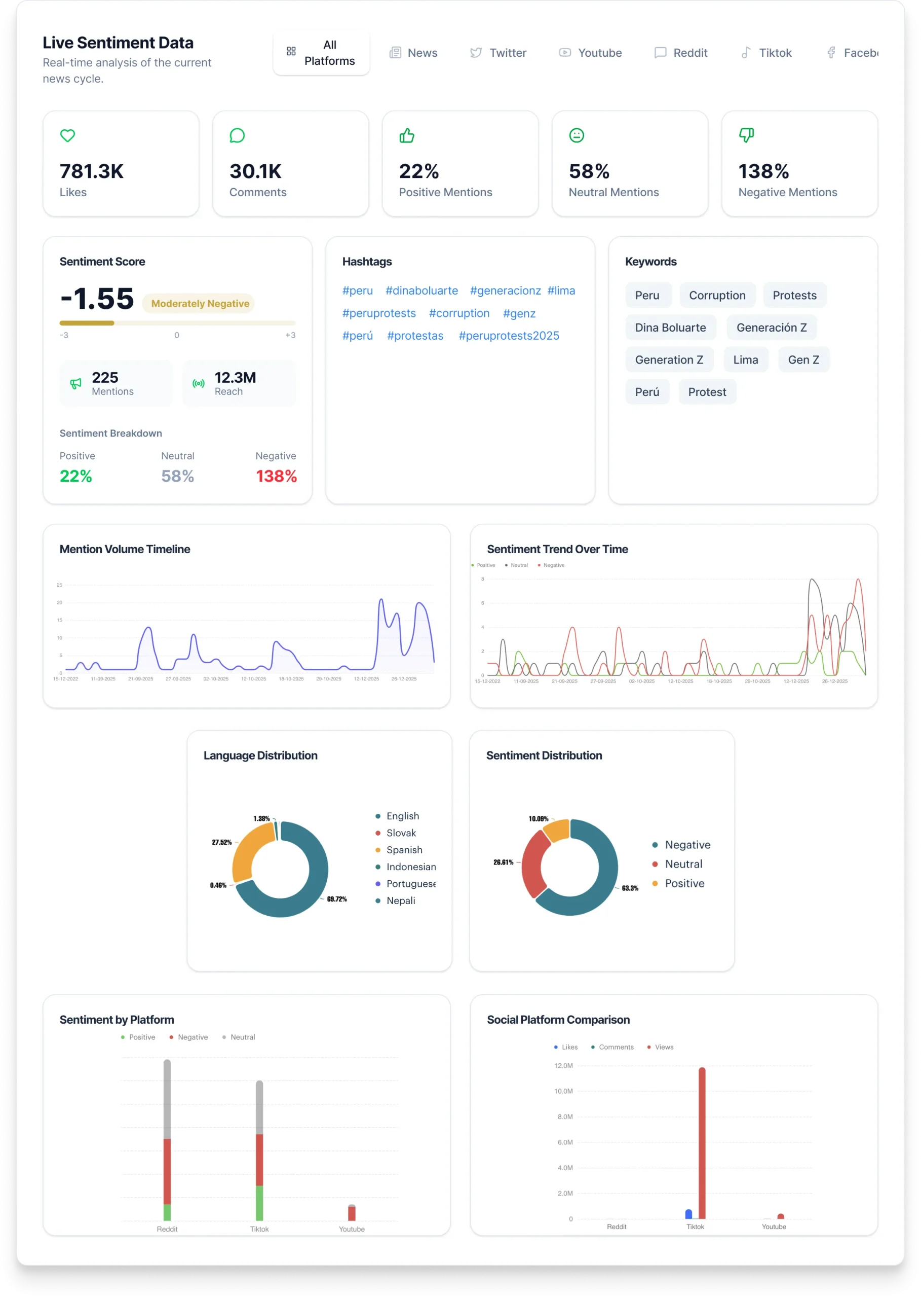 According to the data, Gen Z voices dominate the platforms such as X and Instagram, where hashtags like generationez, peruprotests, and dinaboluarte are sharply growing. Lima-based conversations are more negative, as they represent being closer to clashes and the presence of police, whereas they become more neutral when mentioning regions other than the capital, which discusses economic apprehension instead of violence on the streets.