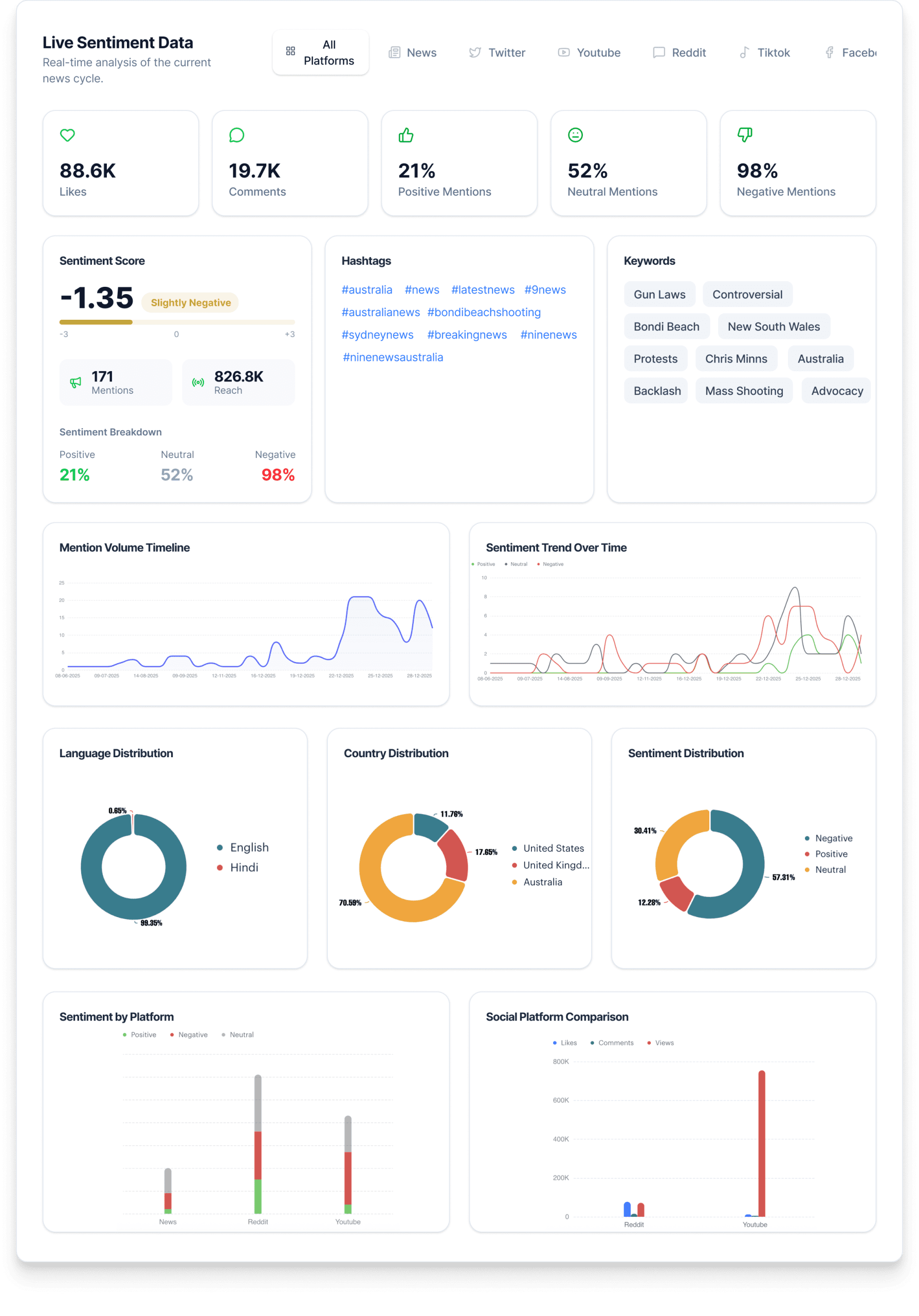 The media monitoring dashboard of Media Watcher shows that the general sentiment score is somewhat negative (-1.35), pointing to the polarizing view of the population. The number of mentions is high, being 826.8K, which can be taken as evidence of a large number of interactions. Among these mentions, a negative percentage of 57 is recorded, but this is contrasted by 30% neutral and 12% positivity. This implies that issues of civil liberties prevail over the defense of actions in online debates.
