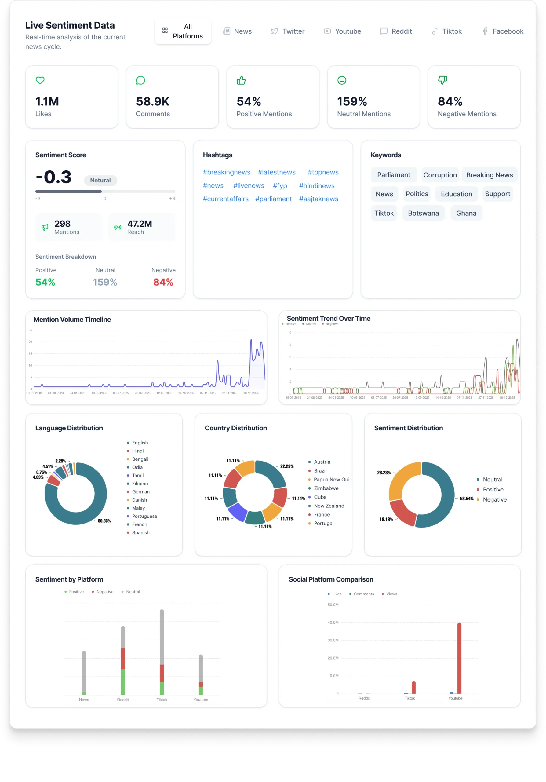 Media Watcher helps make sense of that complexity by going further to surface sentiment for explaining how and why responses differ. It empowers policymakers, analysts, and media teams to read public debate with better context during high-stakes political and social attention periods, with regional mapping, platform-level analysis, and intelligent filtering.