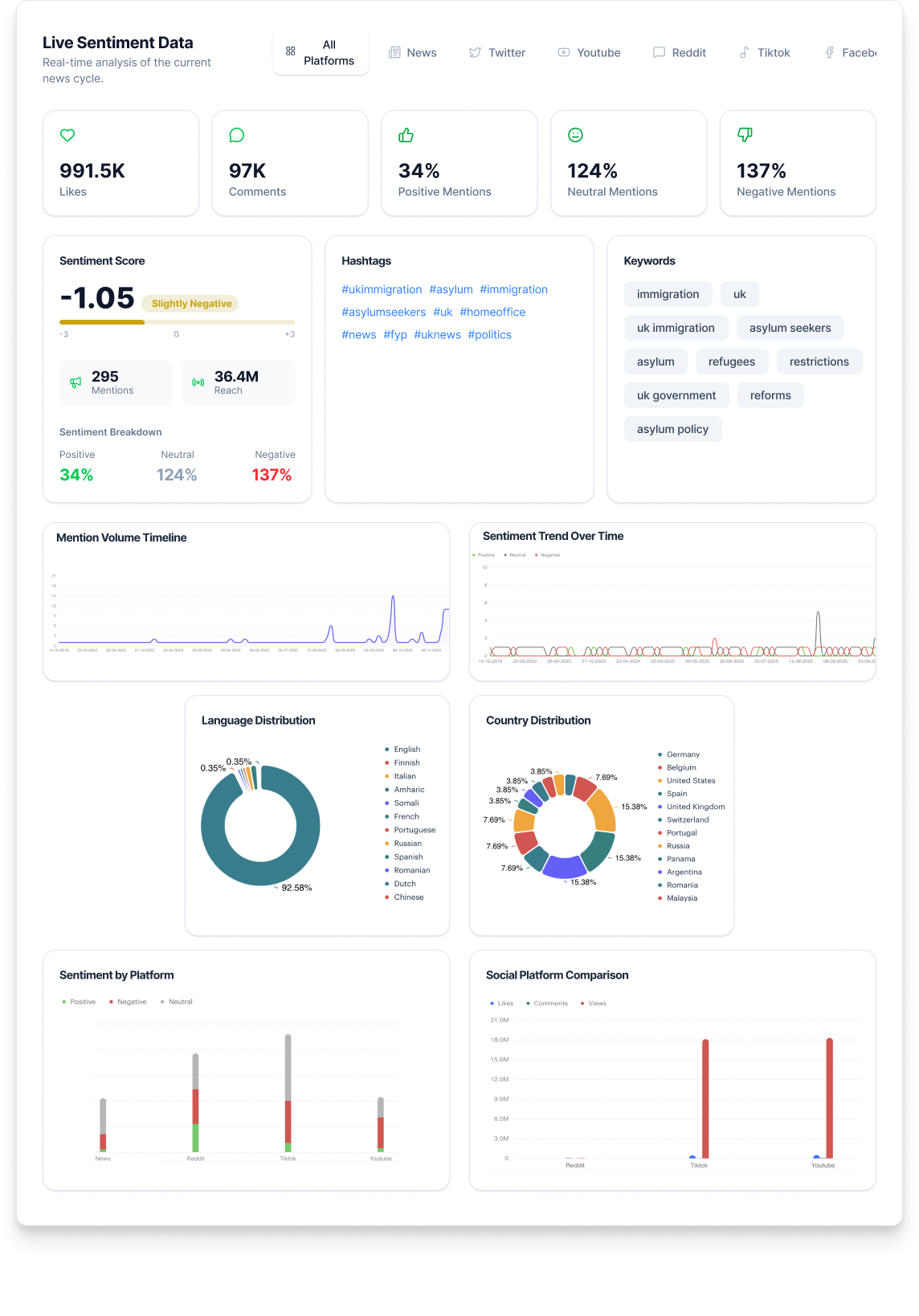Metrics patterns on the media monitoring platform show another layer. The most acute sentiments are discussed on Twitter and Reddit, particularly through hashtags such as #ukimmigration, #asylum, and #asylumseekers. These platforms skew more confrontational and amplify both moral arguments and economic frustrations. In the meantime, there is a tendency toward a cluster of sentiment regionally, with urban areas containing stronger negative sentiment, and rural/economically strained constituencies containing more neutral or guardedly positive sentiments.